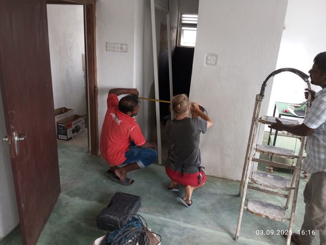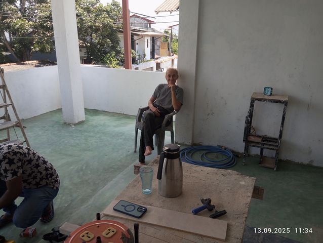 Jayasiri schmeisst den Zement an die Wand. |