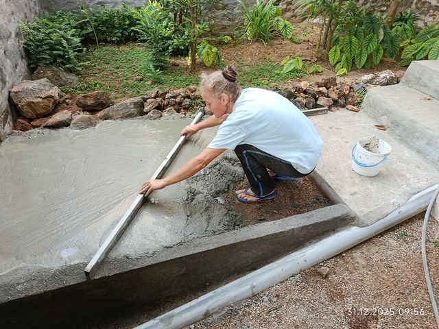 | Kann es also losgehen. Nach 5 Portionen war alles fertig. Jacky zieht den Rest glatt und ... | .schwupp haben wir einen neuen, geraden, erhoehten Untergrund . Video 40 |